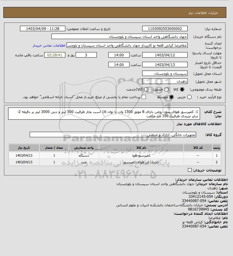 | 1 | -- | کمپرسور هوا | دستگاه | 1 | 1403/04/13 |
