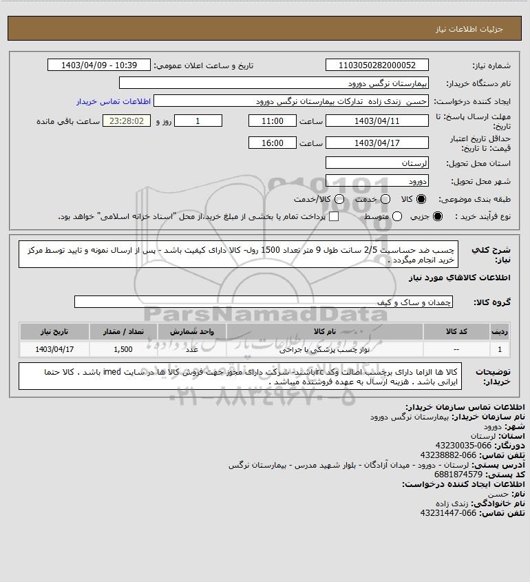 شرح کلی نیاز: چسب ضد حساسیت 2/5 سانت طول 9 متر تعداد 1500 رول- کالا دارای کیفیت باشد - پس از ارسال نمونه و تایید توسط مرکز خرید انجام میگردد .
