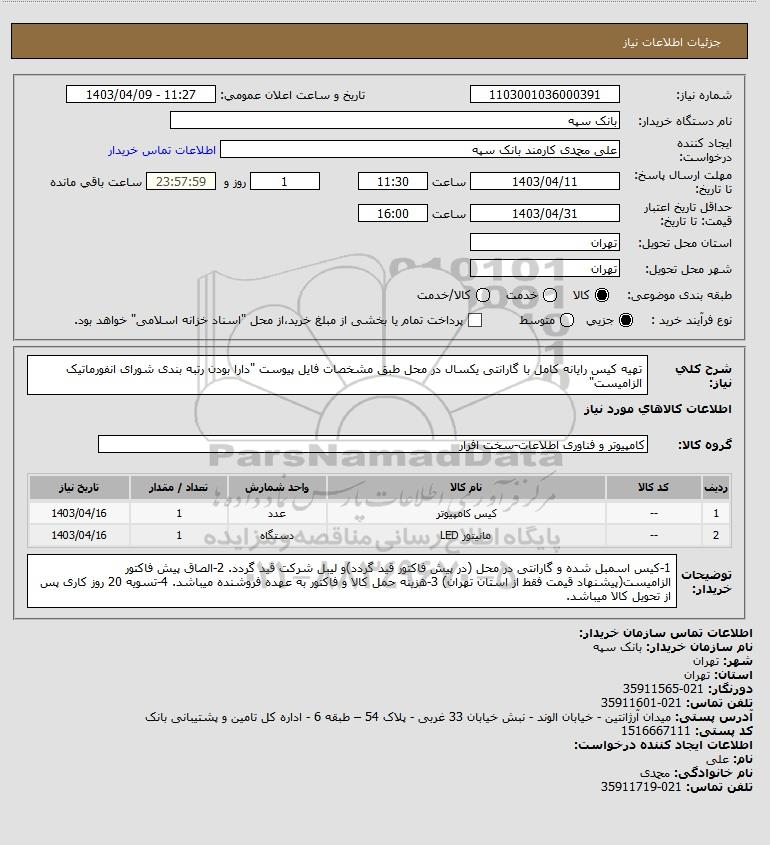 | 2 | -- | مانیتور LED | دستگاه | 1 | 1403/04/16 |