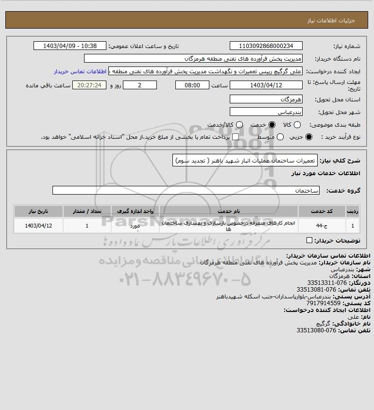 شرح کلی نیاز: تعمیرات ساختمان عملیات انبار شهید باهنر ( تجدید سوم)