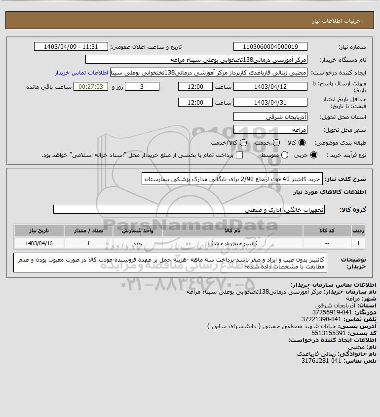 شرح کلی نیاز: خرید کانتینر 40 فوت ارتفاع 2/90 برای بایگانی مدارک پزشکی بیمارستان
