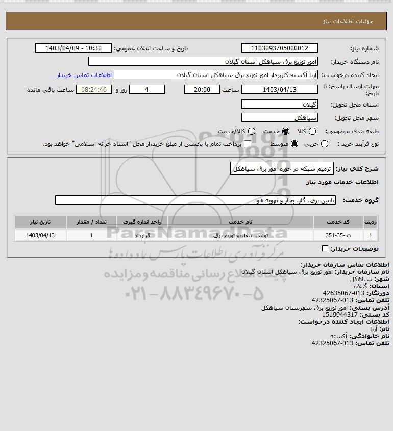 شرح کلی نیاز: ترمیم شبکه در حوزه امور برق سیاهکل