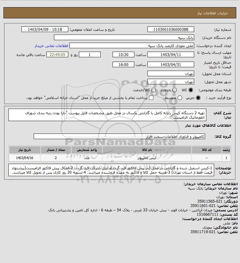 استعلام بها و موضوع استعلام استعلام تهیه 2 دستگاه کیس رایانه کامل با گارانتی یکسال در محل طبق مشخصات فایل پیوست "دارا بودن رتبه بندی شورای انفورماتیک الزامیست" به اطلاع کلیه شرکتها و افراد متخصص واجد شرایط میرساند، آگهی گذار در نظر دارد از طریق استعلام بها، نسبت به انتخاب و دریافت پیشنهادات اقدام نماید. این استعلام با کد آگهی ثبت شده در سامانه خبرگزاری پارس نماد : 7658053 منتشر شده است. مشخصات استعلام : تاریخ شروع استعلام: 1403/04/09 آخرین مهلت ارسال پیشنهاد قیمت : 1403/04/11 و محل اجرای پروژه : استان تهران میباشد. استعلام قیمت مورد درخواست : استعلام تهیه 2 دستگاه کیس رایانه کامل با گارانتی یکسال در محل طبق مشخصات فایل پیوست "دارا بودن رتبه بندی شورای انفورماتیک الزامیست" با دستهبندیهای تخصصی و گروه های مرتبط : کامپیوتر, استعلام اطلاع رسانی میگردد.