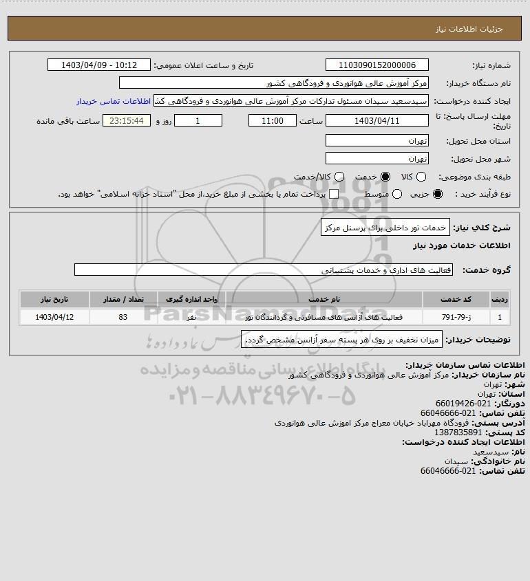 شرح کلی نیاز: خدمات تور داخلی برای پرسنل مرکز