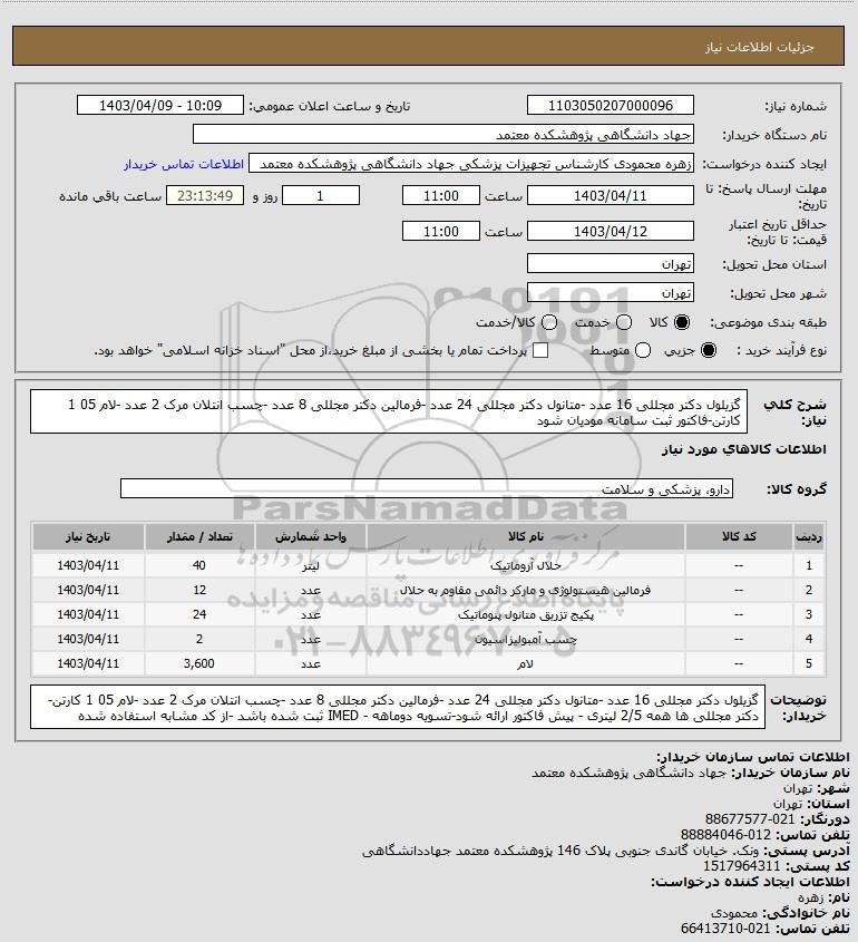 شرح کلی نیاز: گزیلول دکتر مجللی 16 عدد -متانول دکتر مجللی 24 عدد -فرمالین دکتر مجللی 8 عدد -چسب انتلان مرک 2 عدد -لام 05 1 کارتن-فاکتور ثبت سامانه مودیان شود