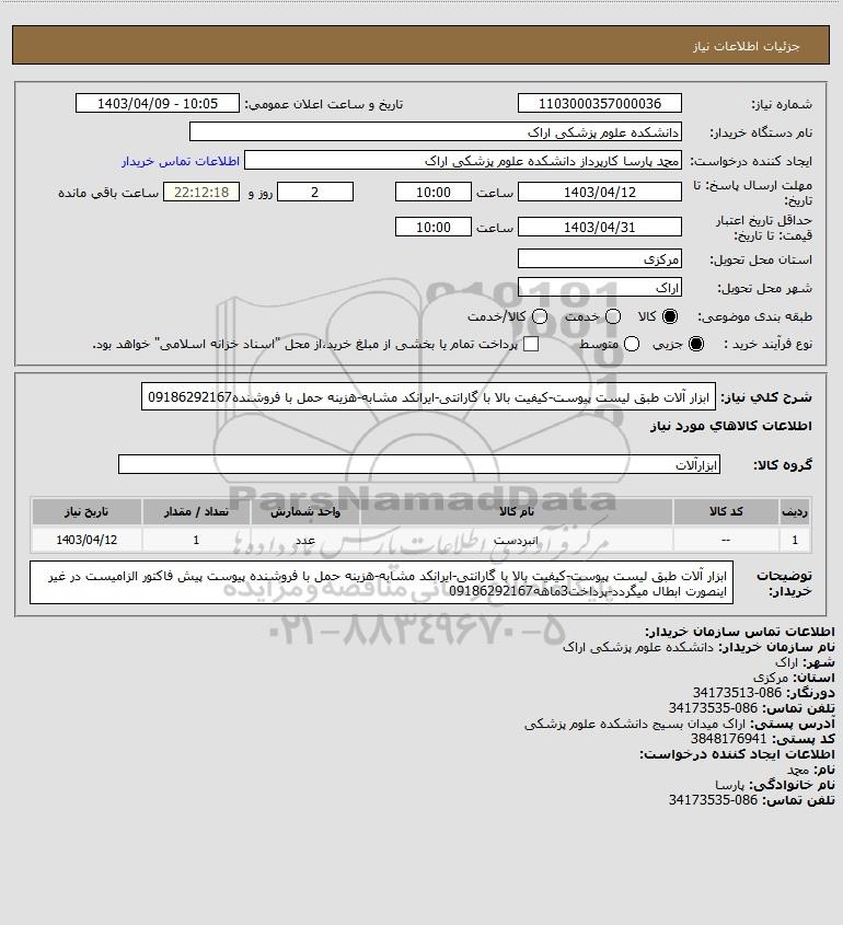 نام دستگاه خریدار:دانشکده علوم پزشکی اراک