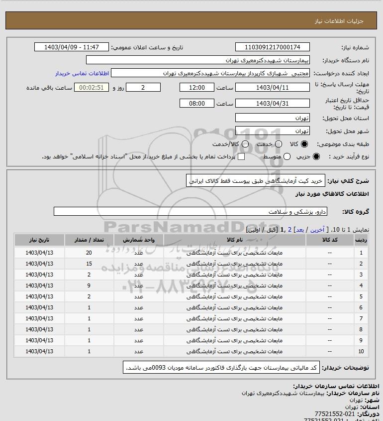 شرح کلی نیاز: خرید کیت آزمایشگاهی طبق پیوست فقط کالای ایرانی