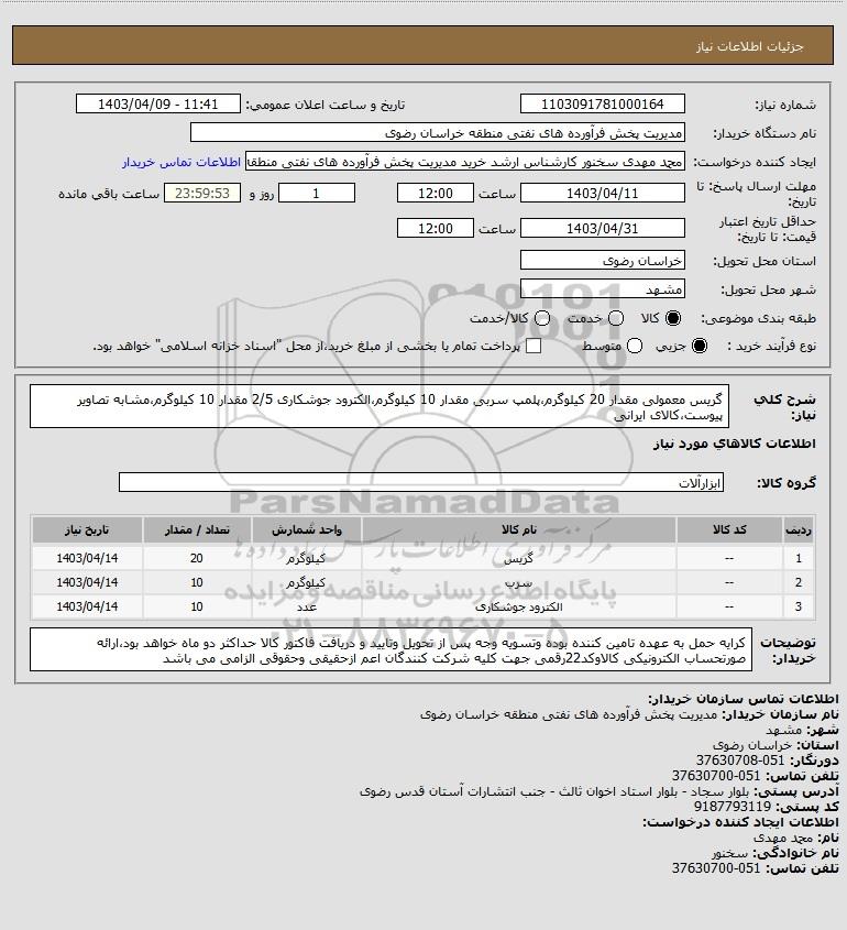 شرح کلی نیاز: گریس معمولی مقدار 20 کیلوگرم،پلمپ سربی مقدار 10 کیلوگرم،الکترود جوشکاری 2/5 مقدار 10 کیلوگرم،مشابه تصاویر پیوست،کالای ایرانی