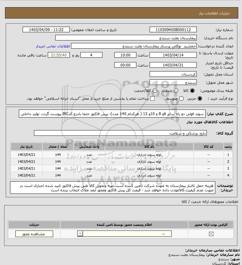 | 4 | -- | لوله سوند ادراری | عدد | 144 | 1403/04/21 |