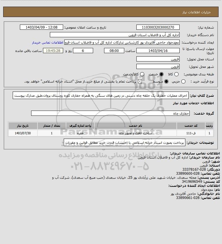 شرح کلی نیاز: اجرای عملیات حفاری یک حلقه چاه دستی در زمین های سنگی به همراه حفاری کوره روستای پروان.طبق مدارک پیوست