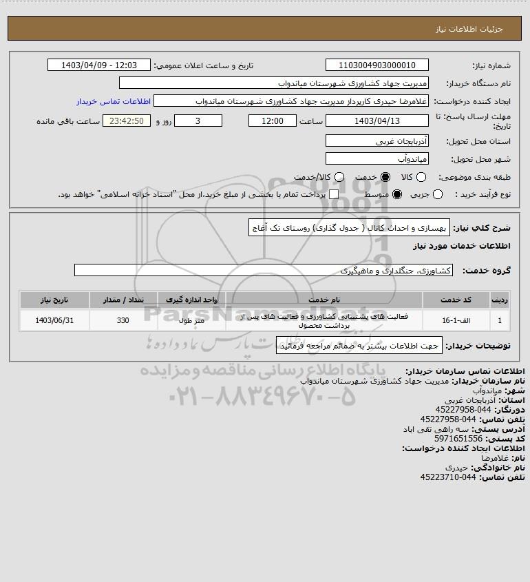 شرح کلی نیاز: بهسازی و احداث کانال ( جدول گذاری) روستای تک آغاج