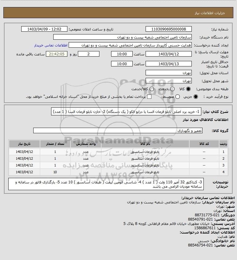 | 4 | -- | تابلو فرمان آسانسور | عدد | 10 | 1403/04/12 |