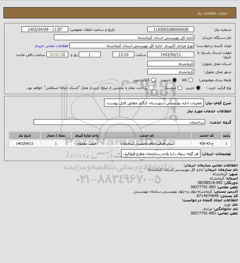 شرح کلی نیاز: تعمیرات اداره بهزیستی شهرستان کنگاور مطابق فایل پیوست.