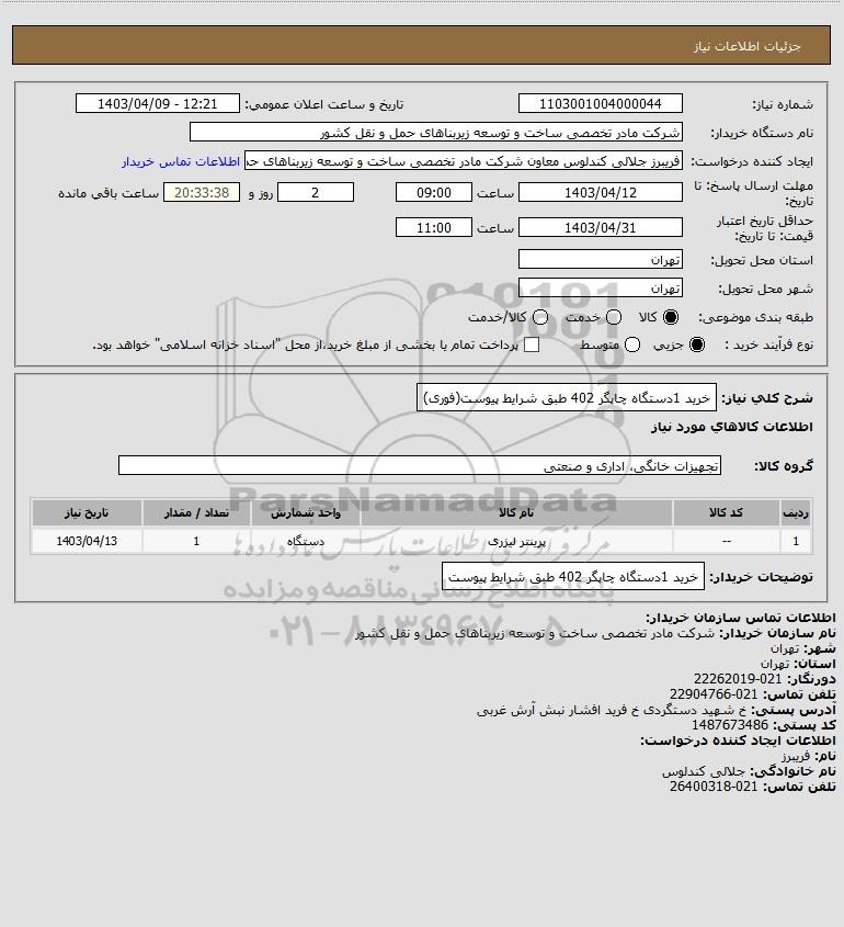 شرح کلی نیاز: خرید 1دستگاه چاپگر 402 طبق شرایط پیوست(فوری)