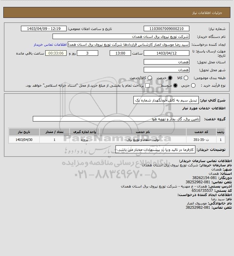 شرح کلی نیاز: تبدیل سیم به کابل خودنگهدار شماره یک