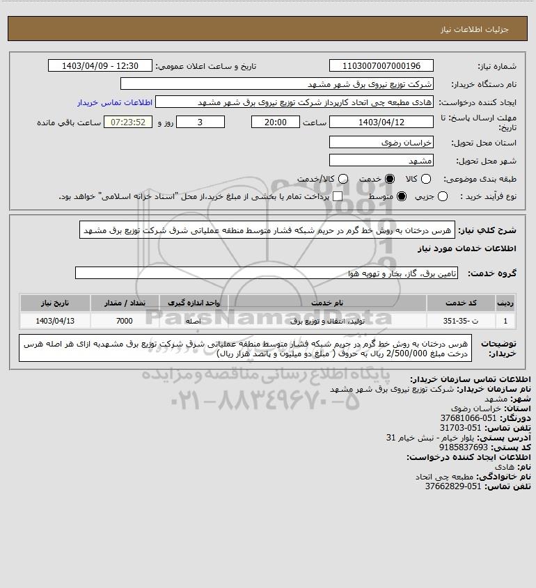 توضیحات خریدار:هرس درختان به روش خط گرم در حریم شبکه فشار متوسط منطقه عملیاتی شرق شرکت توزیع برق مشهدبه ازای هر اصله هرس درخت مبلغ 2/500/000 ریال به حروف ( مبلغ دو میلیون و پانصد هزار ریال)