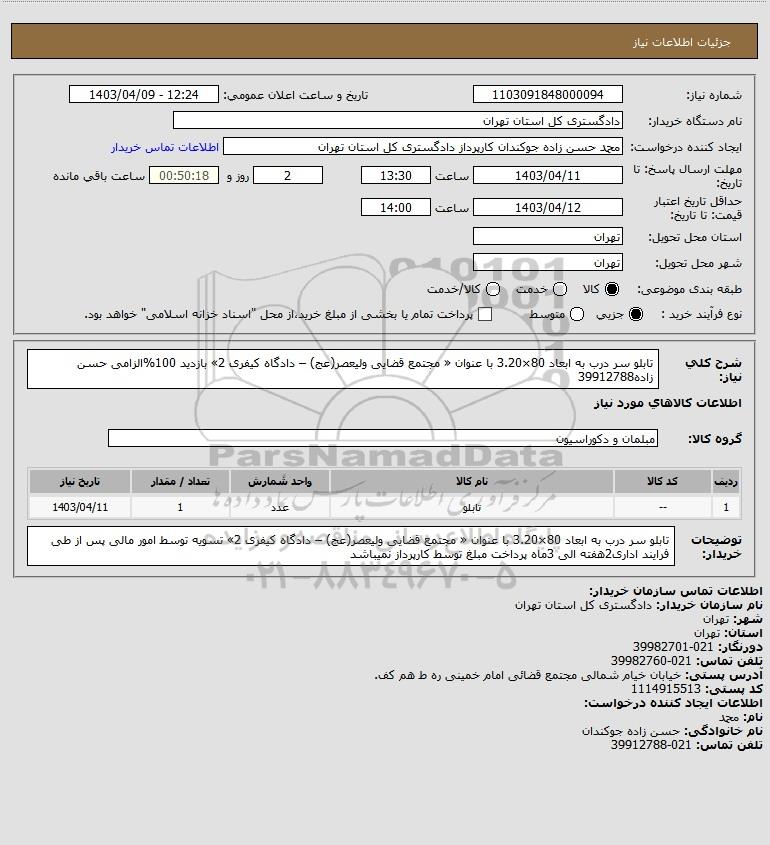 شرح کلی نیاز: تابلو سر درب به ابعاد 80×3.20 با عنوان « مجتمع قضایی ولیعصر(عج) – دادگاه کیفری 2» بازدید 100%الزامی حسن زاده39912788