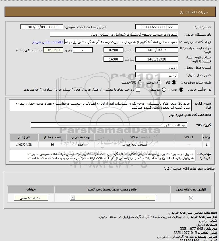 استعلام بها و موضوع استعلام استعلام خرید 36 ردیف اقلام تاسیساتی درجه یک و استاندارد اعم از لوله و اتصالات به پیوست درخواست و تعداد.هزینه حمل ، بیمه و سایر کسورات بعهده تامین کننده میباشد به اطلاع کلیه شرکتها و افراد متخصص واجد شرایط میرساند، آگهی گذار در نظر دارد از طریق استعلام بها، نسبت به انتخاب و دریافت پیشنهادات اقدام نماید. این استعلام با کد آگهی ثبت شده در سامانه خبرگزاری پارس نماد : 7658835 منتشر شده است. مشخصات استعلام : تاریخ شروع استعلام: 1403/04/09 آخرین مهلت ارسال پیشنهاد قیمت : 1403/04/12 و محل اجرای پروژه : استان اردبیل میباشد. استعلام قیمت مورد درخواست : استعلام خرید 36 ردیف اقلام تاسیساتی درجه یک و استاندارد اعم از لوله و اتصالات به پیوست درخواست و تعداد.هزینه حمل ، بیمه و سایر کسورات بعهده تامین کننده میباشد با دستهبندیهای تخصصی و گروه های مرتبط : تاسیسات ساختمانی, لوله و اتصالات, استعلام اطلاع رسانی میگردد.