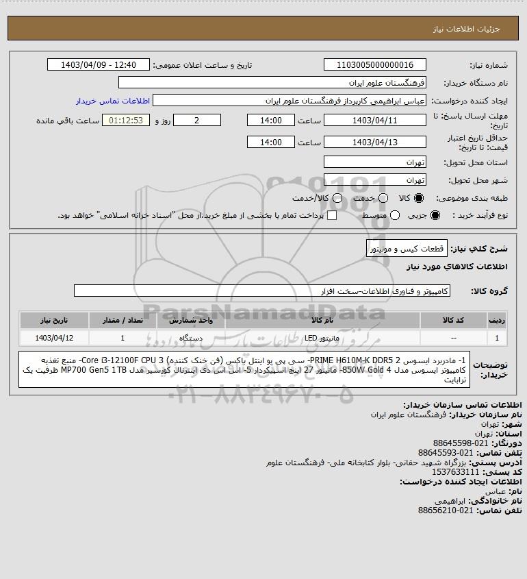 شرح کلی نیاز: قطعات کیس و مونیتور
