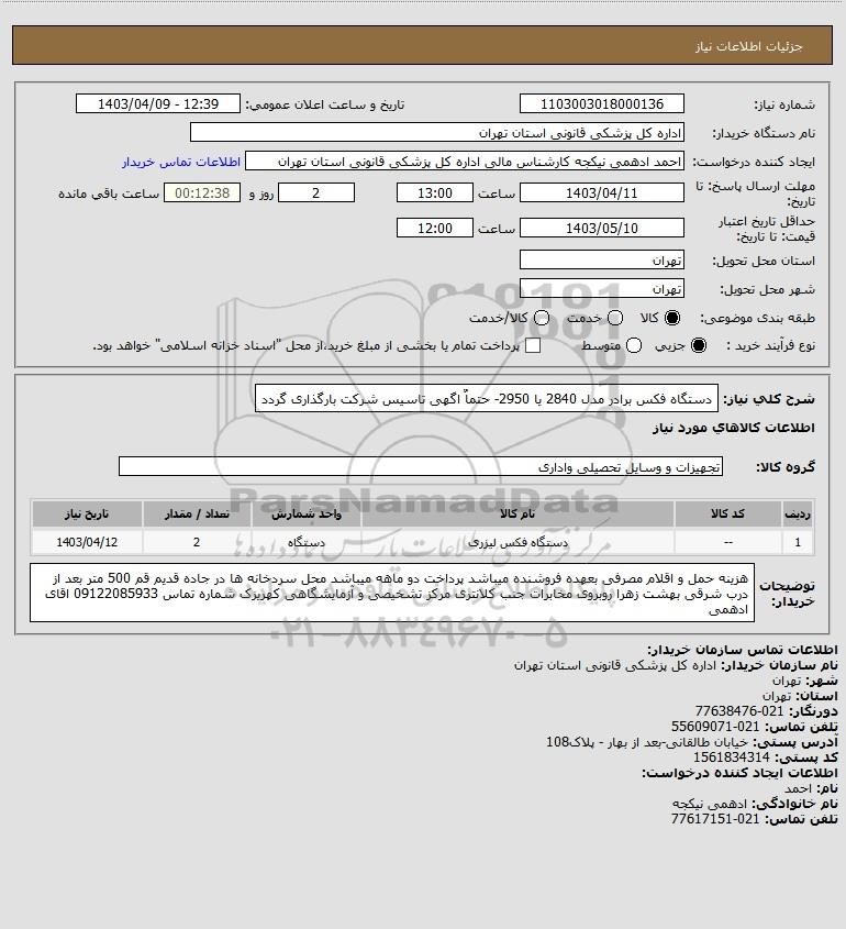 | 1 | -- | دستگاه فکس لیزری | دستگاه | 2 | 1403/04/12 |