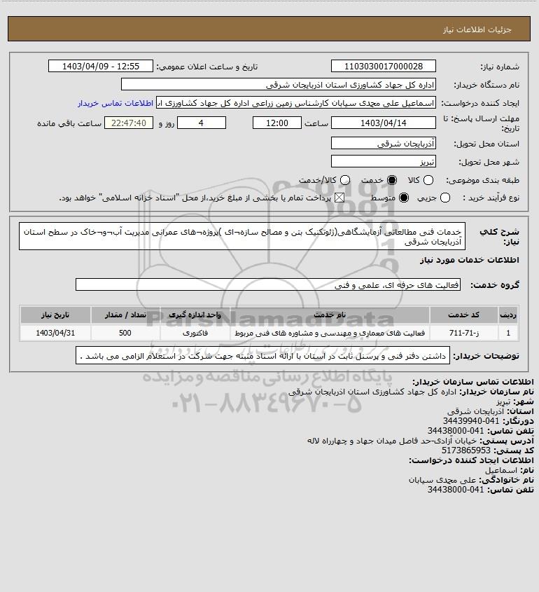 استعلام خدمات فنی مطالعاتی آزمایشگاهی(ژئوتکنیک بتن و مصالح سازه¬ای )پروژه¬های عمرانی مدیریت آب¬و¬خاک در سطح استان آذربایجان شرقی, استعلام خدمات فنی مطالعاتی آزمایشگاهی(ژئوتکنیک بتن و مصالح سازه¬ای )پروژه¬های عمرانی مدیریت آب¬و¬خاک در سطح استان آذربایجان شرقی