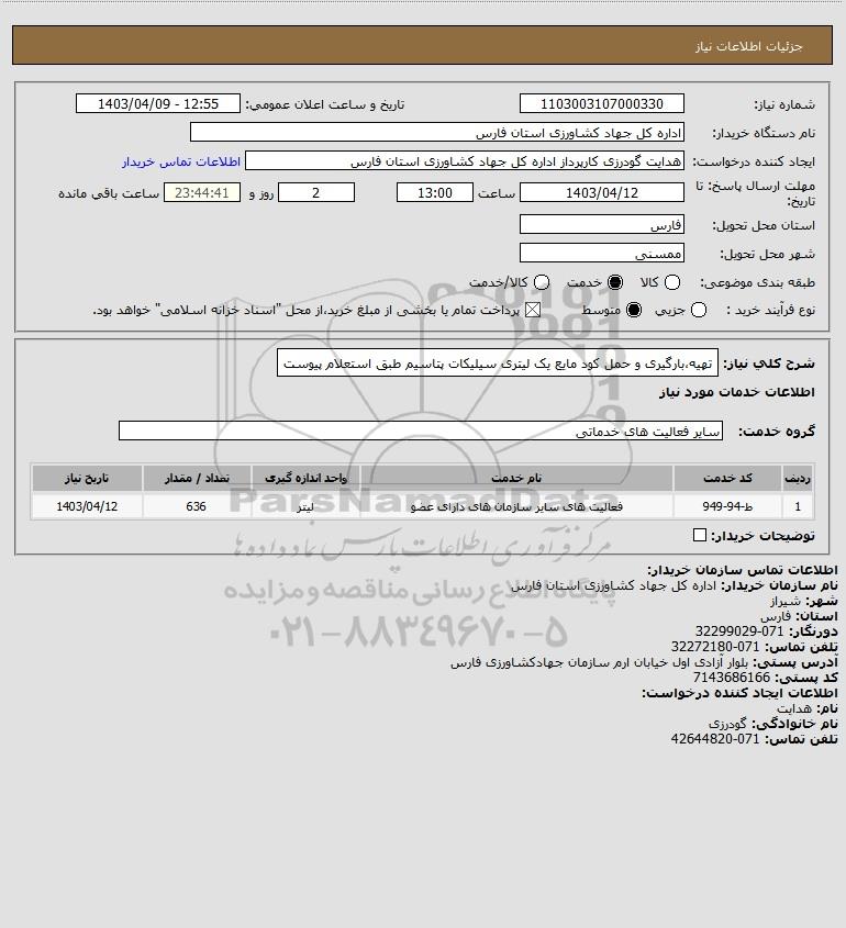 شرح کلی نیاز: تهیه،بارگیری و حمل کود مایع یک لیتری سیلیکات پتاسیم طبق استعلام پیوست