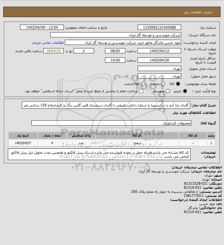 استعلام بها و موضوع استعلام استعلام گلدان بابا آدم یا سانسوریا یا شفلرا داخلی طبیعی با گلدان سیلندری فایبر گلس رنگ بژ کرم-ارتفاع 150 سانتی متر به اطلاع کلیه شرکتها و افراد متخصص واجد شرایط میرساند، آگهی گذار در نظر دارد از طریق استعلام بها، نسبت به انتخاب و دریافت پیشنهادات اقدام نماید. این استعلام با کد آگهی ثبت شده در سامانه خبرگزاری پارس نماد : 7659088 منتشر شده است. مشخصات استعلام : تاریخ شروع استعلام: 1403/04/09 آخرین مهلت ارسال پیشنهاد قیمت : 1403/04/12 و محل اجرای پروژه : استان تهران میباشد. استعلام قیمت مورد درخواست : استعلام گلدان بابا آدم یا سانسوریا یا شفلرا داخلی طبیعی با گلدان سیلندری فایبر گلس رنگ بژ کرم-ارتفاع 150 سانتی متر با دستهبندیهای تخصصی و گروه های مرتبط : تجهیزات و خدمات کشاورزی و دامپروری, استعلام اطلاع رسانی میگردد.