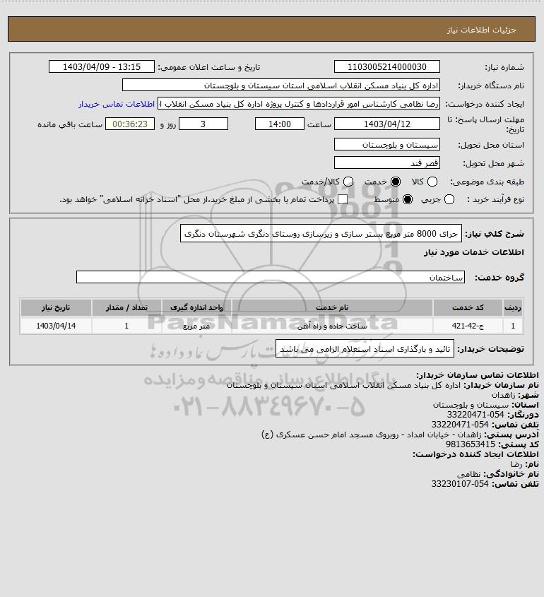 شرح کلی نیاز: جرای 8000 متر مربع بستر سازی و زیرسازی روستای دنگری شهرستان دنگری