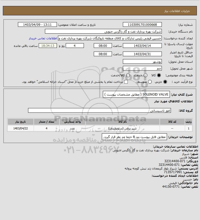شرح کلی نیاز: SOLENOID VALVE ( مطابق مشخصات پیوست )