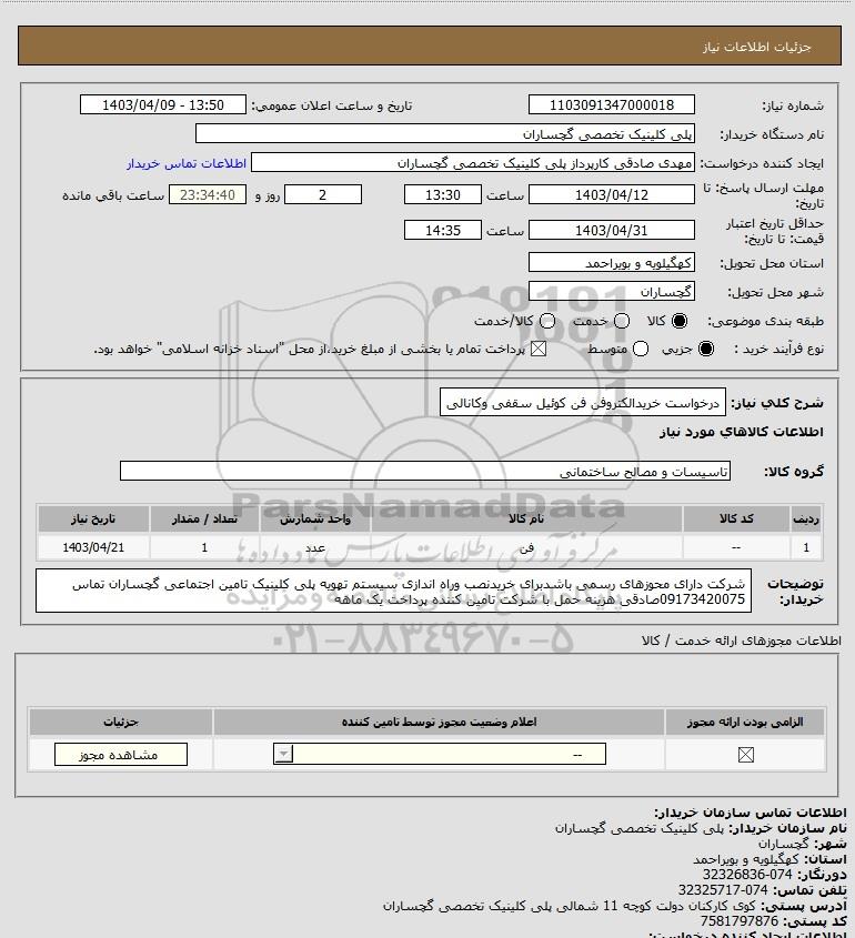 استعلام درخواست خریدالکتروفن فن کوئیل سقفی وکانالی, استعلام درخواست خریدالکتروفن فن کوئیل سقفی وکانالی