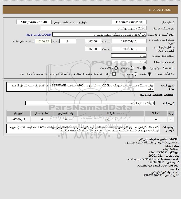 شرح کلی نیاز: پراب دستگاه عیب یاب آلتراسونیک d:11mm -200khz و 400khz - ساخت STARMANS از هر کدام یک ست شامل 2 عدد پراب