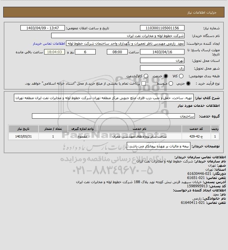 شرح کلی نیاز: تهیه، ساخت، حمل و نصب درب فلزی ضلع جنوبی مرکز منطقه تهران شرکت خطوط لوله و مخابرات نفت ایران منطقه تهران