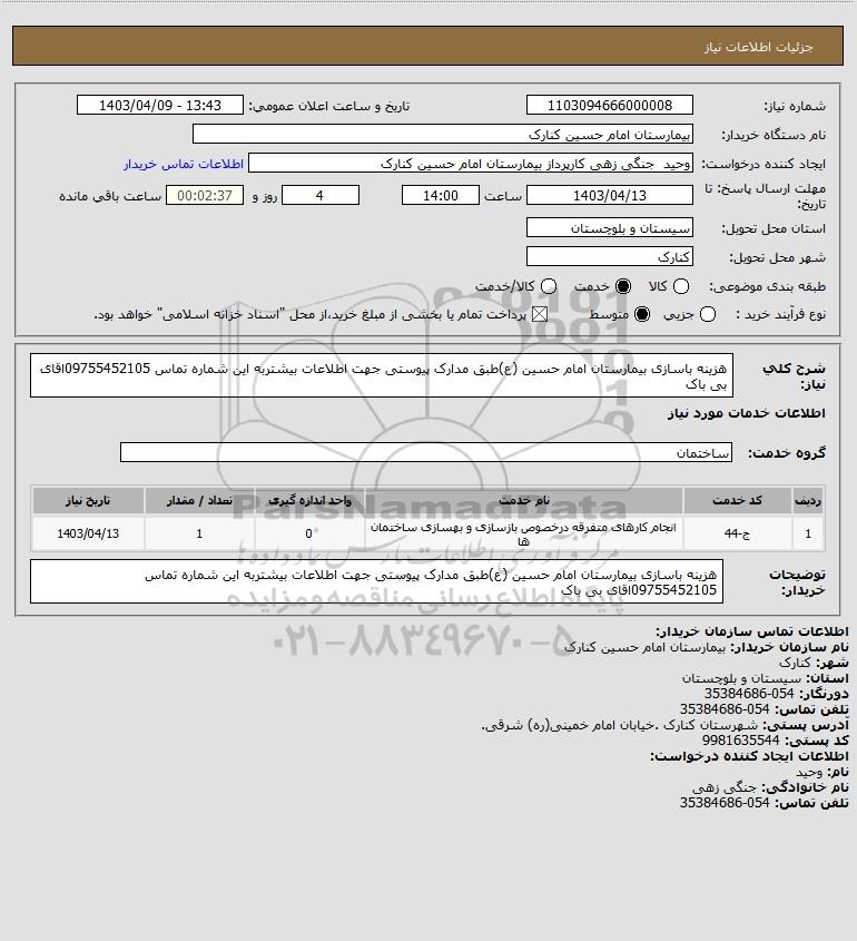 شرح کلی نیاز: هزینه باسازی بیمارستان امام حسین (ع)طبق مدارک پیوستی جهت اطلاعات بیشتربه این شماره تماس 09755452105اقای بی باک
