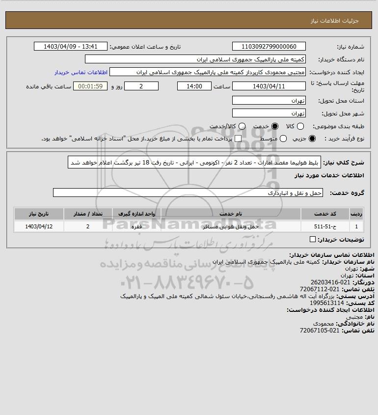 نام دستگاه خریدار:کمیته ملی پارالمپیک جمهوری اسلامی ایران
