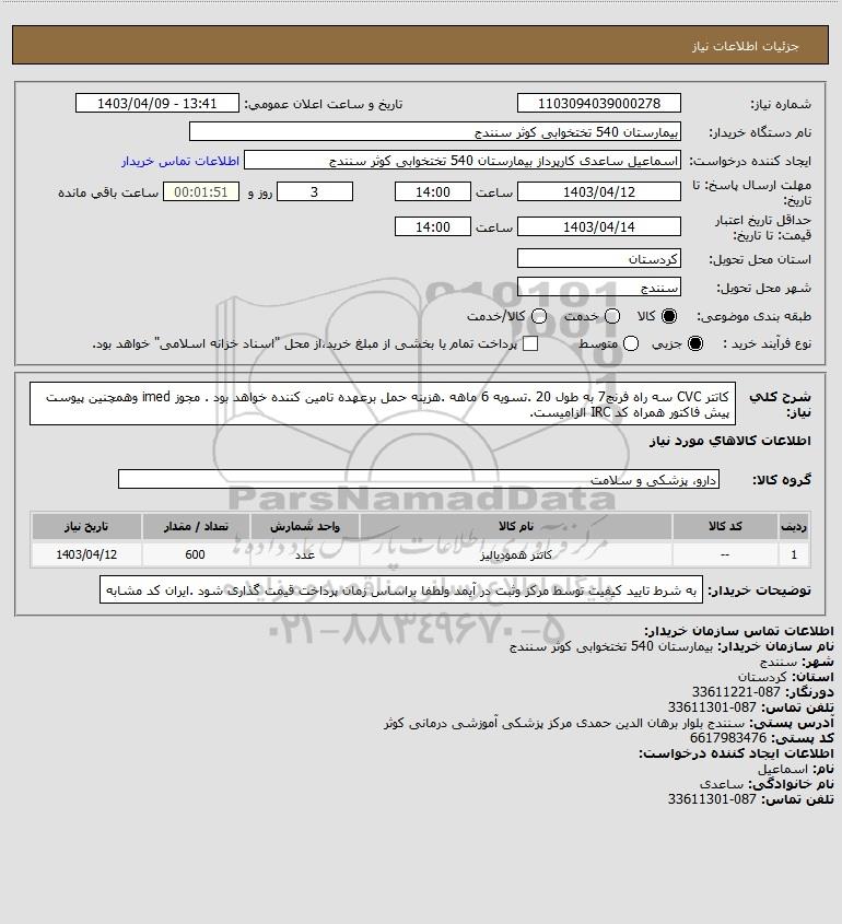 | 1 | -- | کاتتر همودیالیز | عدد | 600 | 1403/04/12 |