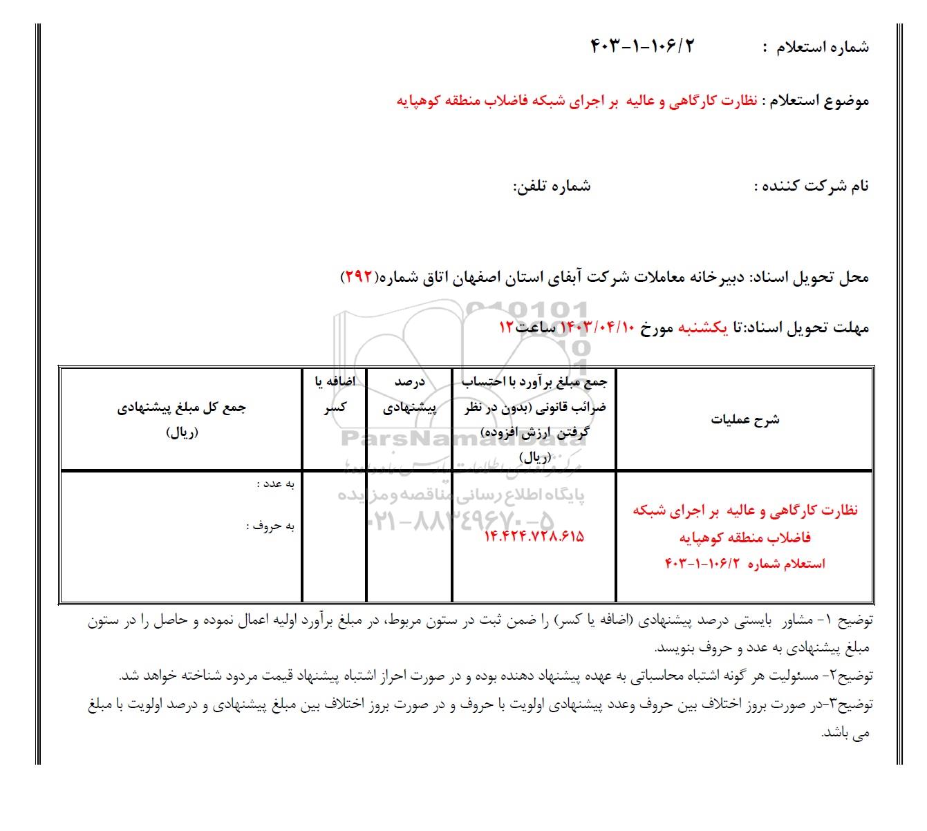 موضوع استعلام: نظارت عالیه و کارگاهی بر اجرای شبکه فاضلاب منطقه کوهپایه