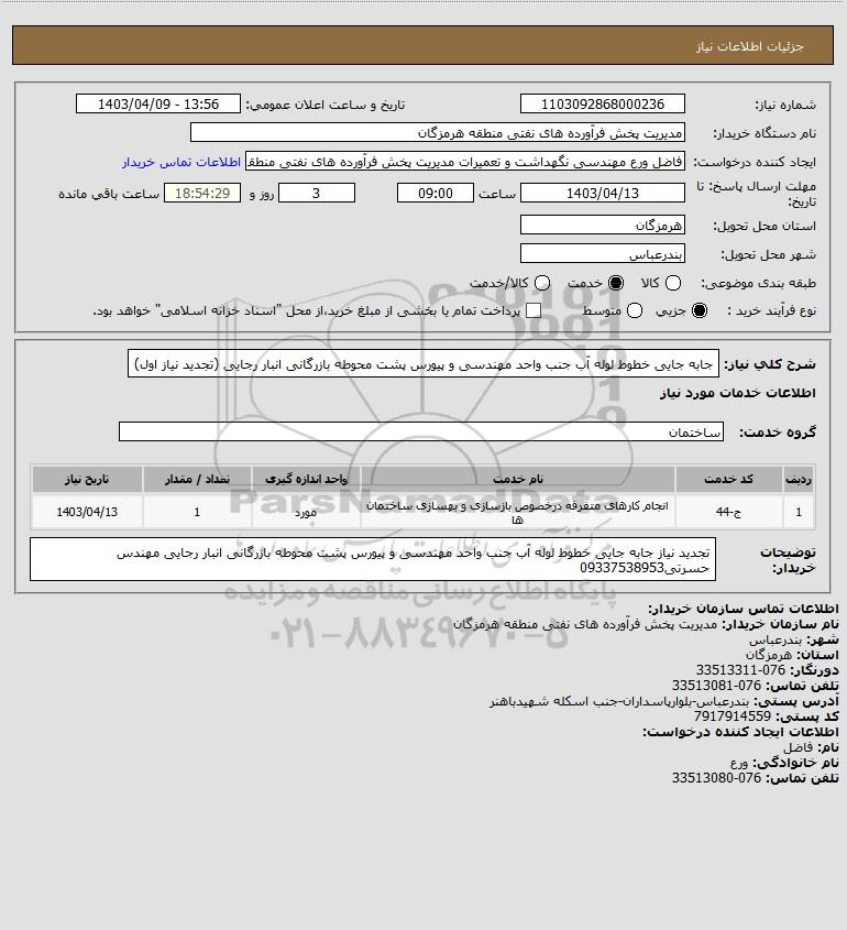 شرح کلی نیاز: جابه جایی خطوط لوله آب جنب واحد مهندسی و پیورس پشت محوطه بازرگانی انبار رجایی (تجدید نیاز اول)
