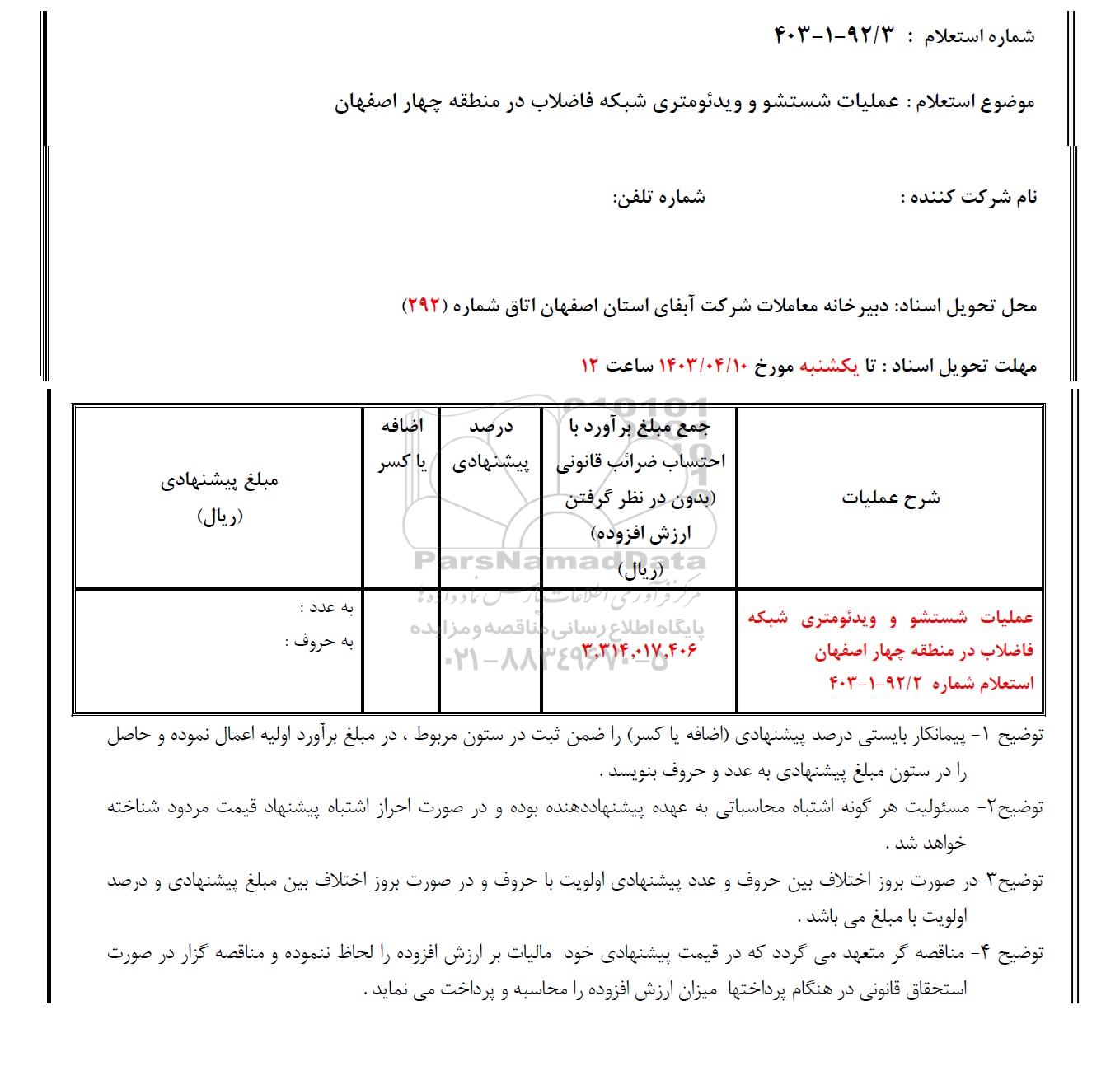 موضوع استعلام: عملیات شستشو و ویدئومتری شبکه فاضلاب در منطقه چهار اصفهان