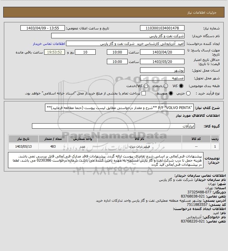 استعلام بها و موضوع استعلام استعلام "P/F "VOLVO PENTA **شرح و مقدار درخواستی مطابق لیست پیوست (حتما مطالعه فرمایید)** به اطلاع کلیه شرکتها و افراد متخصص واجد شرایط میرساند، آگهی گذار در نظر دارد از طریق استعلام بها، نسبت به انتخاب و دریافت پیشنهادات اقدام نماید. این استعلام با کد آگهی ثبت شده در سامانه خبرگزاری پارس نماد : 7659444 منتشر شده است. مشخصات استعلام : تاریخ شروع استعلام: 1403/04/09 آخرین مهلت ارسال پیشنهاد قیمت : 1403/04/20 و محل اجرای پروژه : استان بوشهر میباشد. استعلام قیمت مورد درخواست : استعلام "P/F "VOLVO PENTA **شرح و مقدار درخواستی مطابق لیست پیوست (حتما مطالعه فرمایید)** با دستهبندیهای تخصصی و گروه های مرتبط : ابزار و یراق آلات, انواع فیلتر های تصفیه, تجهیزات نفت و گاز, استعلام اطلاع رسانی میگردد.