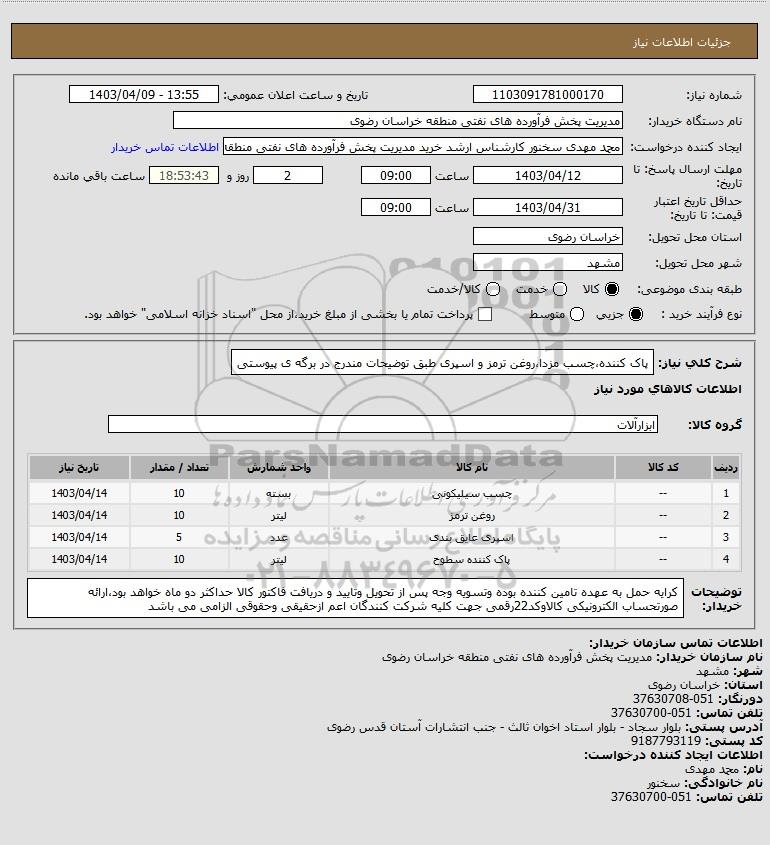 نام دستگاه خریدار:مدیریت پخش فرآورده های نفتی منطقه خراسان رضوی