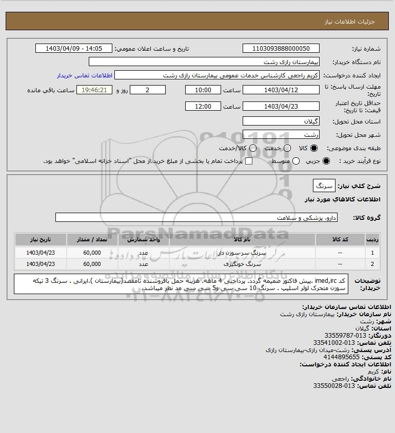 | 2 | -- | سرنگ خونگیری | عدد | 60,000 | 1403/04/23 |