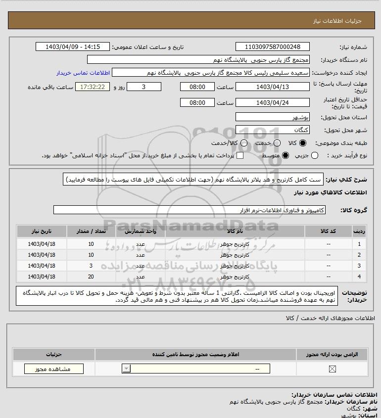 نام دستگاه خریدار:مجتمع گاز پارس جنوبی پالایشگاه نهم