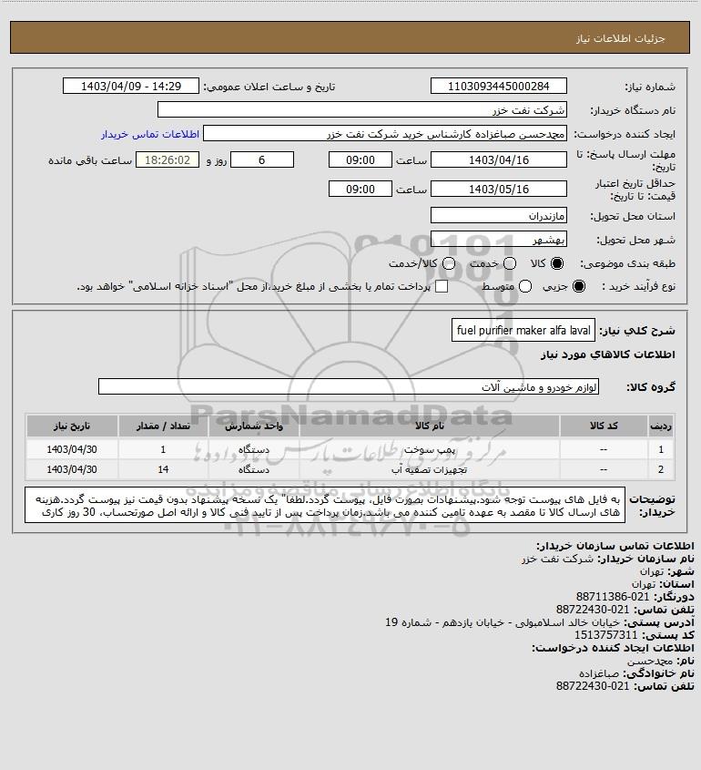 شرح کلی نیاز: fuel purifier maker alfa laval