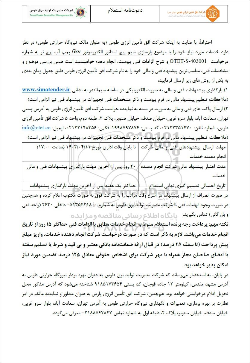 احتراماً با عنایت به اینکه شرکت افق تأمین انرژی طوس (به عنوان مالک نیروگاه حرارتی طوس ) در نظر دارد خدمات مورد نیاز خود را با موضوع بازسازی سیم پیچ استاتور الکتروموتور 6kv پمپ آب برج تر به شماره درخواست 403001-OTET-S و شرح الزامات فنی پیوست انجام دهد؛ خواهشمند است ضمن بررسی موضوع و مشخصات فنی مناسب ترین پیشنهاد فنی و مالی خود را به نام شرکت افق تأمین انرژی طوس طبق جدول زمان بندی به یکی از روشهای زیر ارسال فرمایید