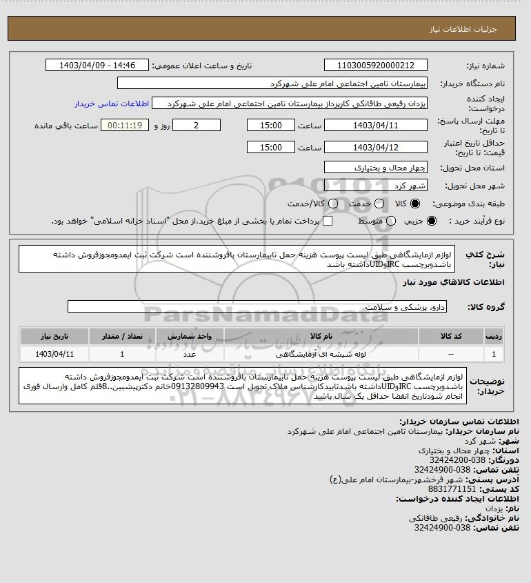 شرح کلی نیاز: لوازم ازمایشگاهی طبق لیست پیوست هزینه حمل تابیمارستان بافروشننده است شرکت ثبت ایمدومجوزفروش داشته باشدوبرچسب IRCوUIDداشته باشد