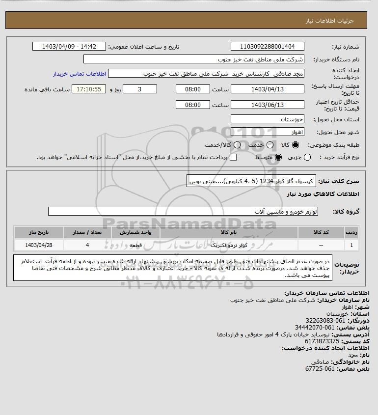 شرح کلی نیاز: کپسول گاز کولر 1234 (5 ،4 کیلویی)....مینی بوس