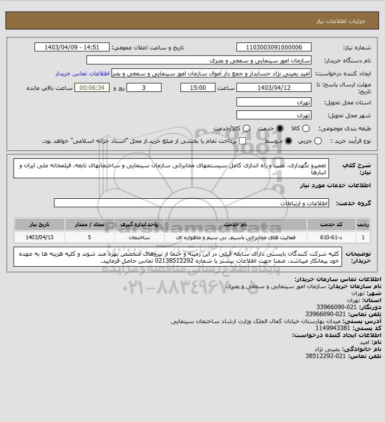 شرح کلی نیاز: تعمیرو نگهداری، نصب و راه اندازی کامل سیستمهای مخابراتی سازمان سینمایی و ساختمانهای تابعه، فیلمخانه ملی ایران و انبارها