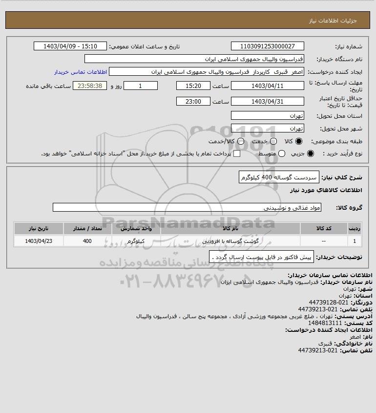 شرح کلی نیاز: سردست گوساله 400 کیلوگرم