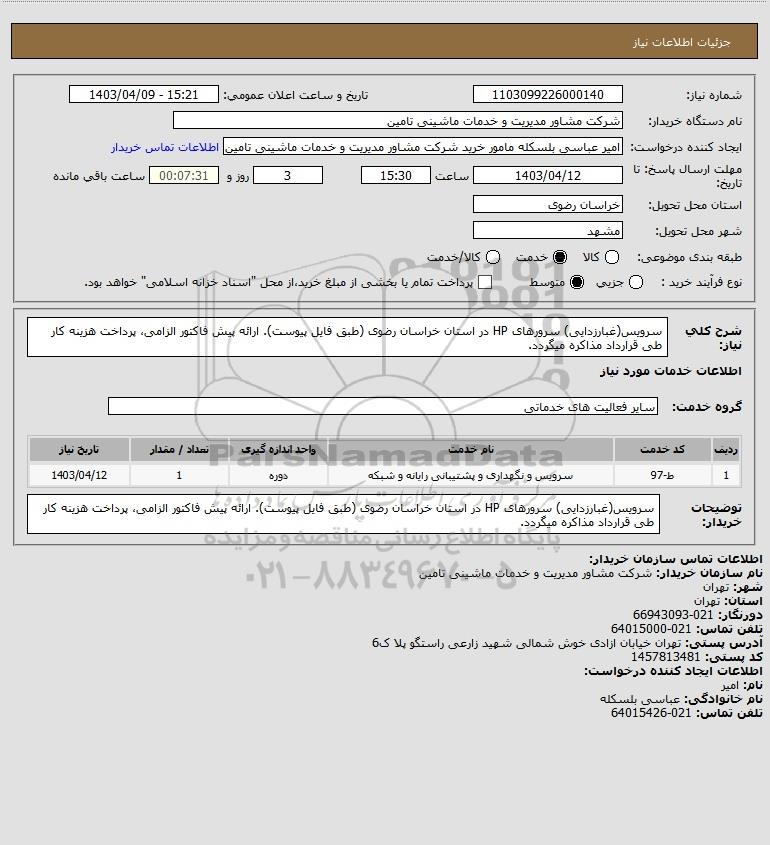 شرح کلی نیاز: سرویس(غبارزدایی) سرورهای HP در استان خراسان رضوی (طبق فایل پیوست). ارائه پیش فاکتور الزامی، پرداخت هزینه کار طی قرارداد مذاکره میگردد.