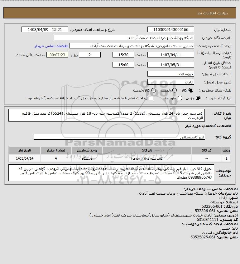 استعلام کمپرسور چهار پایه 24 هزار پیستونی (5532) 2 عدد//کمپرسور سه پایه 18 هزار پیستونی (5524) 2 عدد پیش فاکتور الزامیست, استعلام کمپرسور چهار پایه 24 هزار پیستونی (5532) 2 عدد//کمپرسور سه پایه 18 هزار پیستونی (5524) 2 عدد پیش فاکتور الزامیست